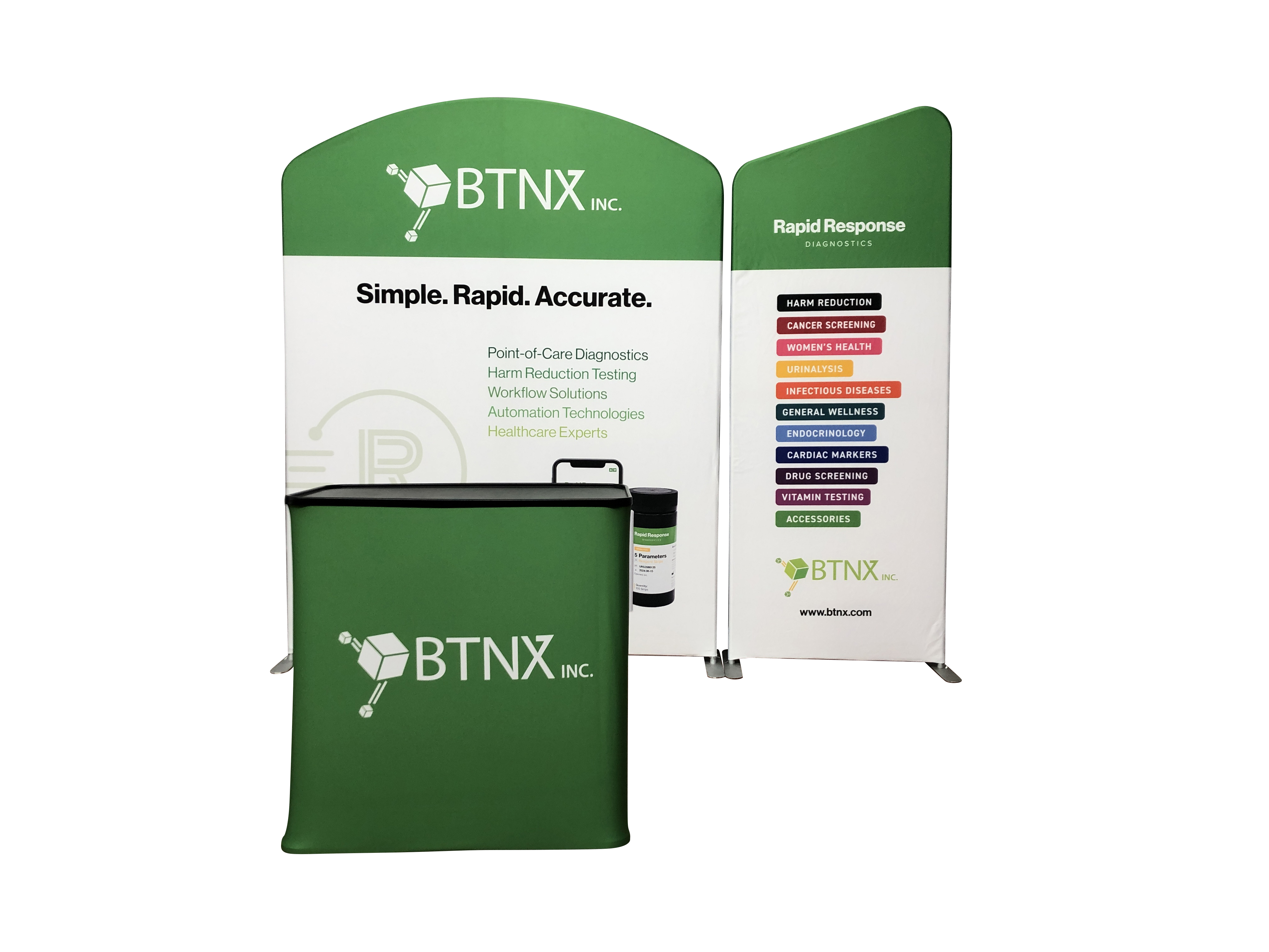 Our 10' Exhibit Kits include everything you need to make a big impact at your next trade show or event. You'll get 10 feet in width of custom double-sided printed tension fabric backdrops plus high-powered LED lights and a wooden shelf perfect for displaying brochures, promotional material, or merchandise. Everything packs up into the included hard-shell plastic wheeled case, that seamlessly converts into your booth's custom podium counter. This case allows for easy transportation in any car or plane, as you can check the case into oversized baggage. All kits include a small TV mount with VESA 75mm x 75mm and 100mm x 100mm compatibility