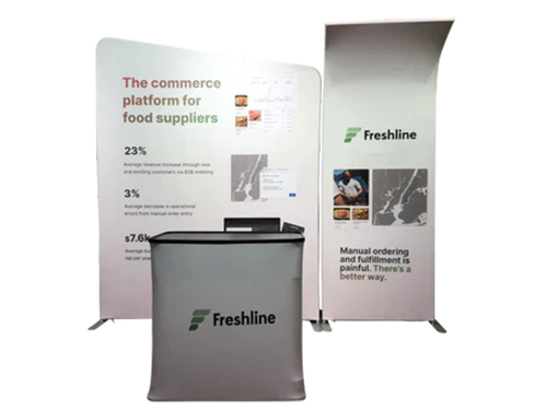 Our 10' Exhibit Kits include everything you need to make a big impact at your next trade show or event. You'll get 10 feet in width of custom double-sided printed tension fabric backdrops plus high-powered LED lights and a wooden shelf perfect for displaying brochures, promotional material, or merchandise. Everything packs up into the included hard-shell plastic wheeled case, that seamlessly converts into your booth's custom podium counter. This case allows for easy transportation in any car or plane, as you can check the case into oversized baggage. All kits include a small TV mount with VESA 75mm x 75mm and 100mm x 100mm compatibility