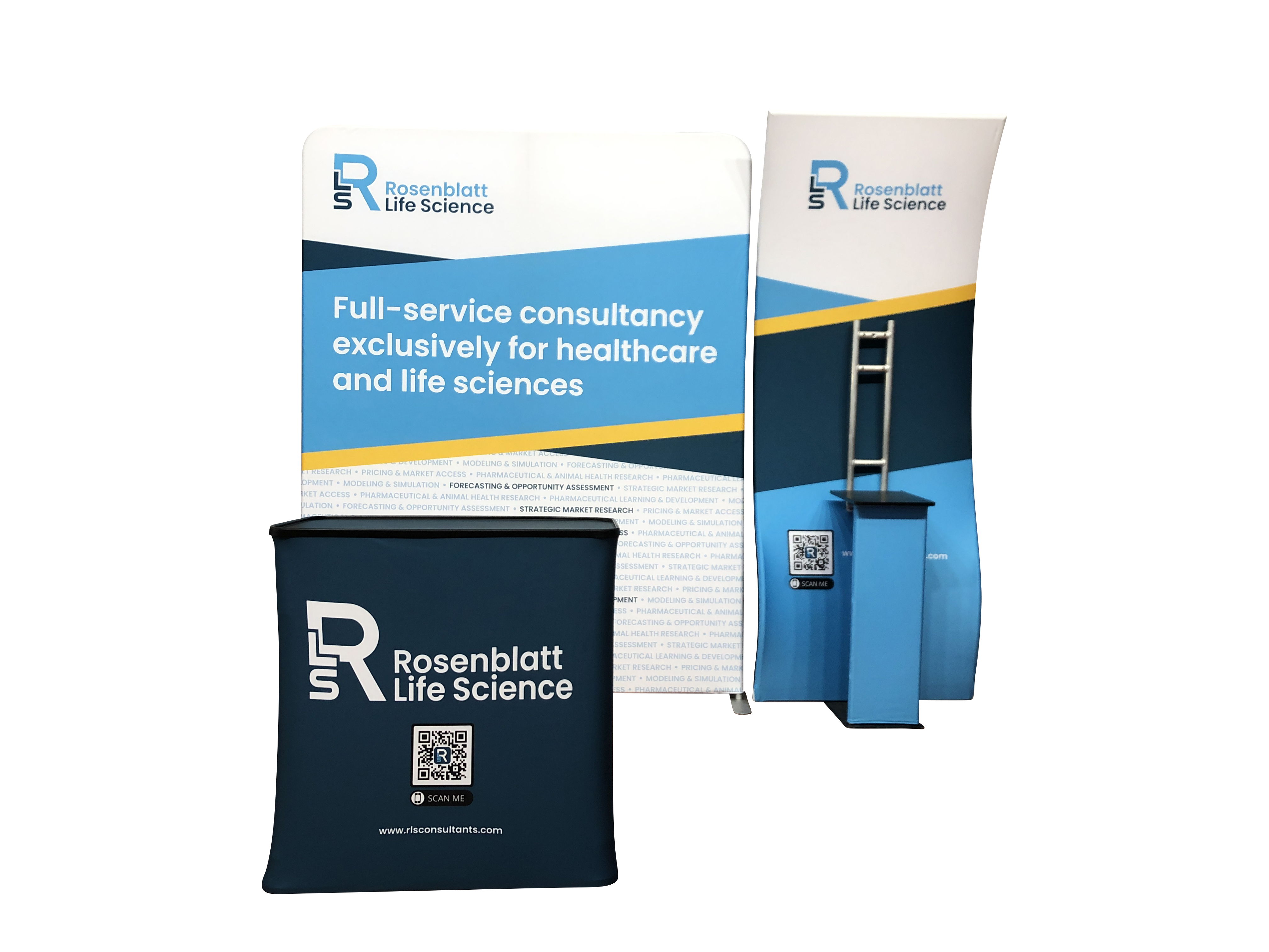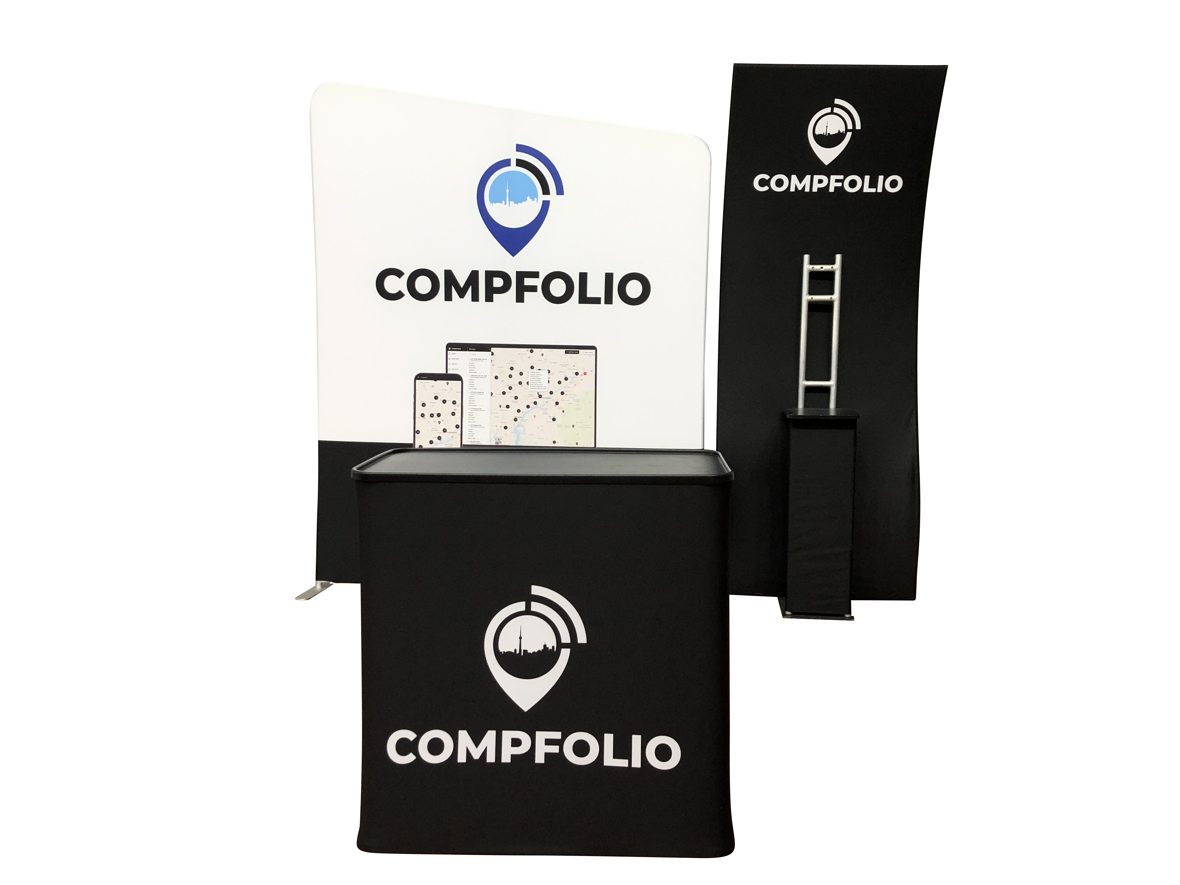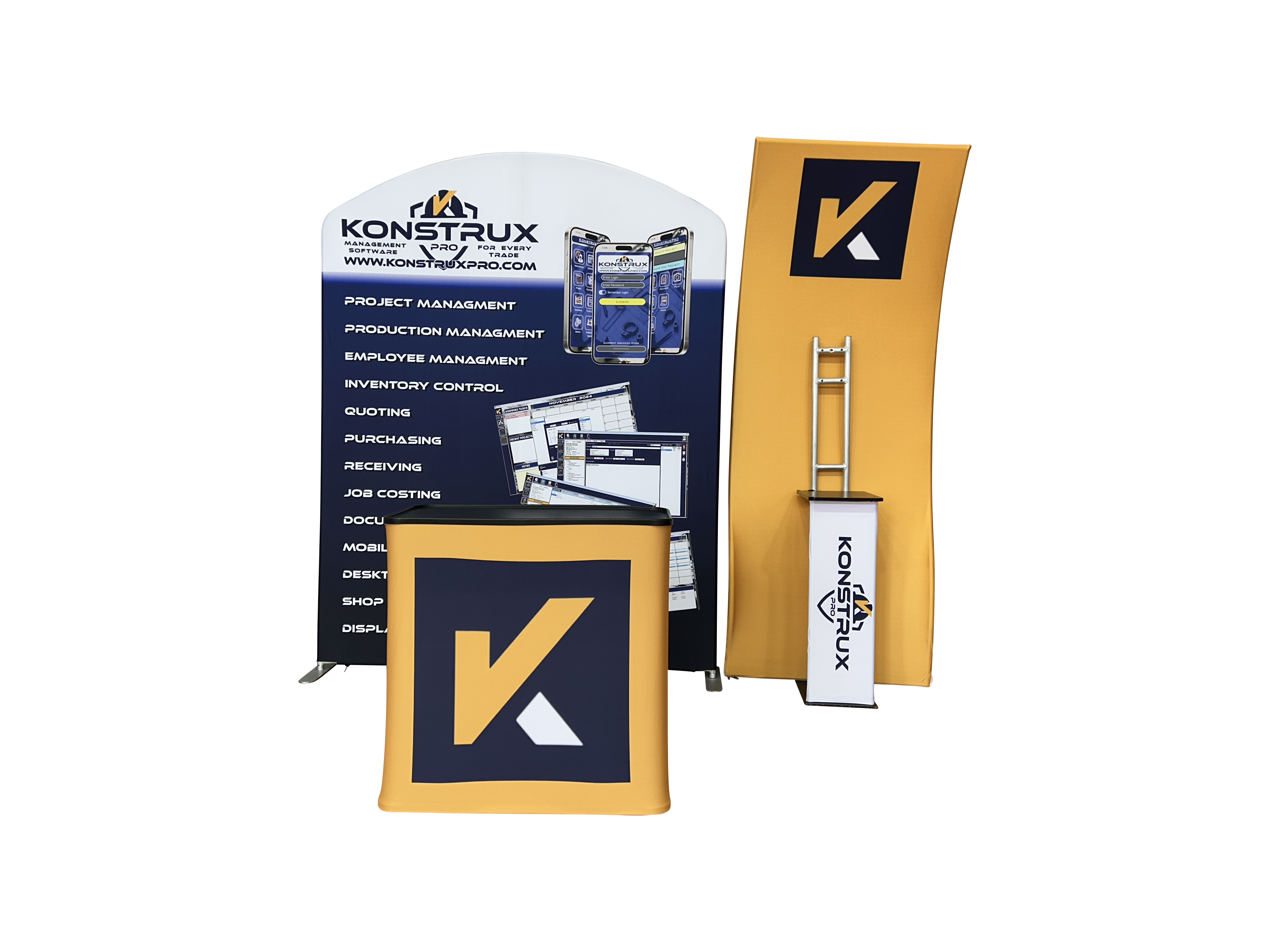 Our 10' Exhibit Kits include everything you need to make a big impact at your next trade show or event. You'll get 10 feet in width of custom double-sided printed tension fabric backdrops plus high-powered LED lights and a wooden shelf perfect for displaying brochures, promotional material, or merchandise. Everything packs up into the included hard-shell plastic wheeled case, that seamlessly converts into your booth's custom podium counter. This case allows for easy transportation in any car or plane, as you can check the case into oversized baggage.