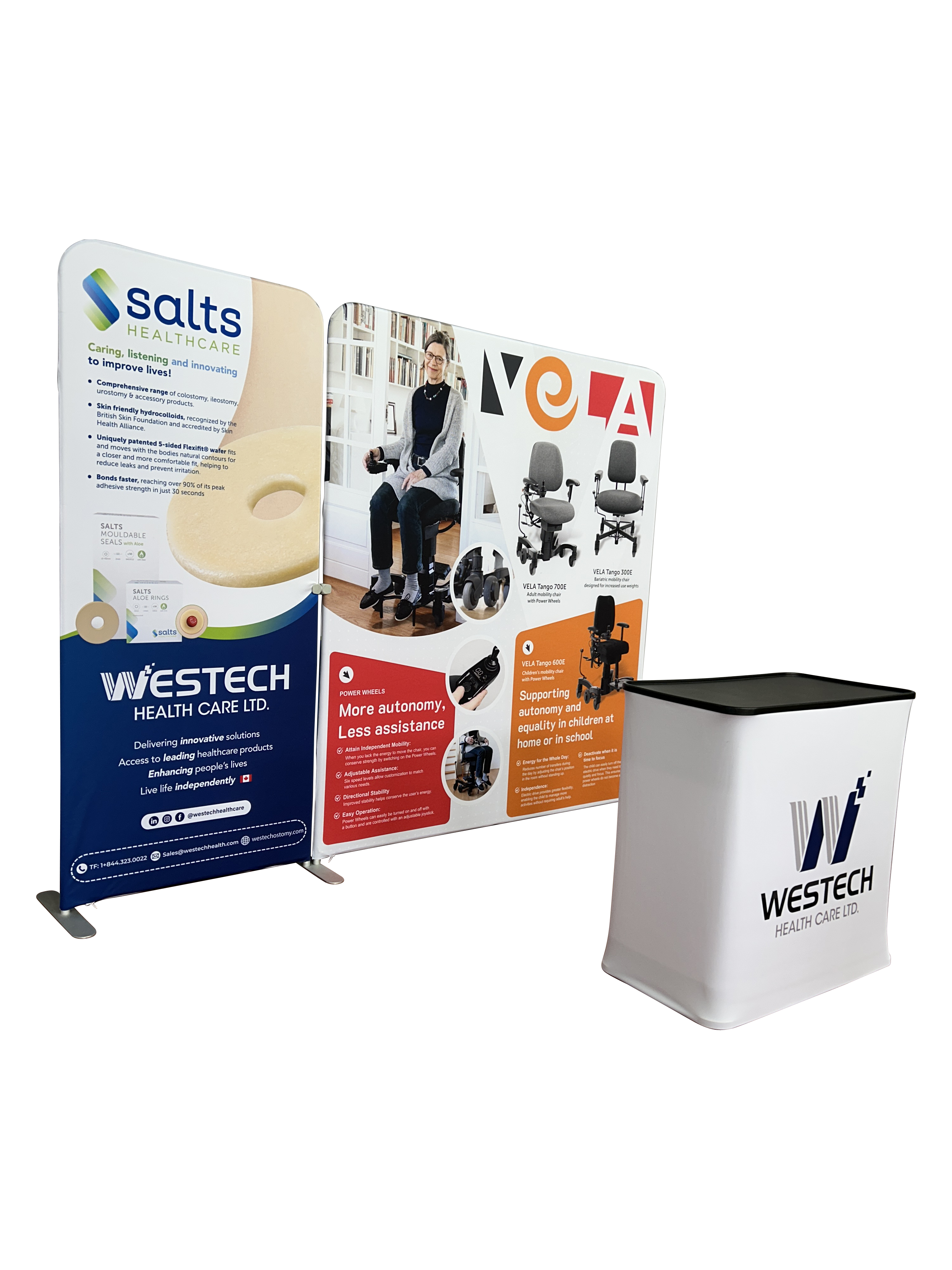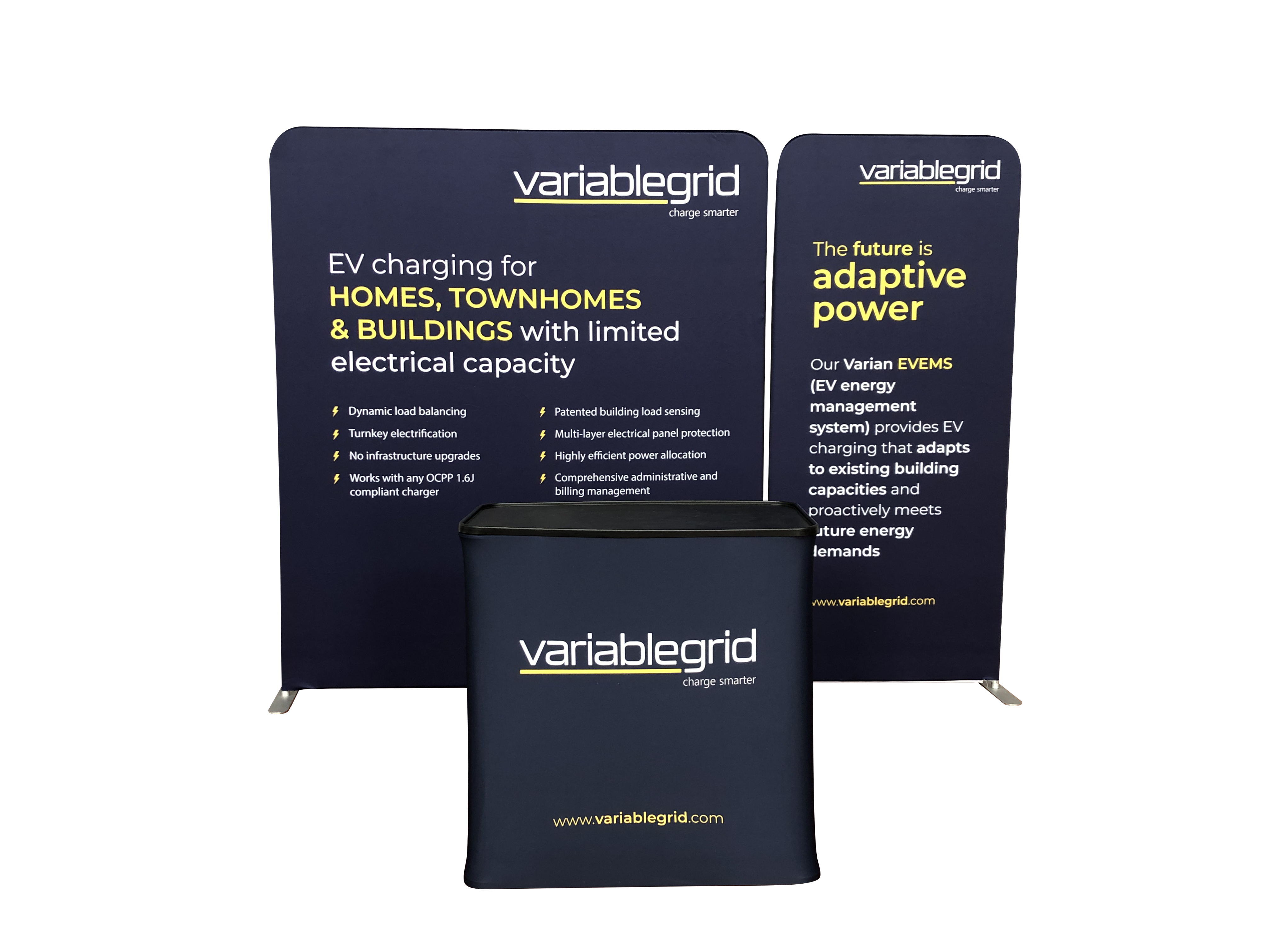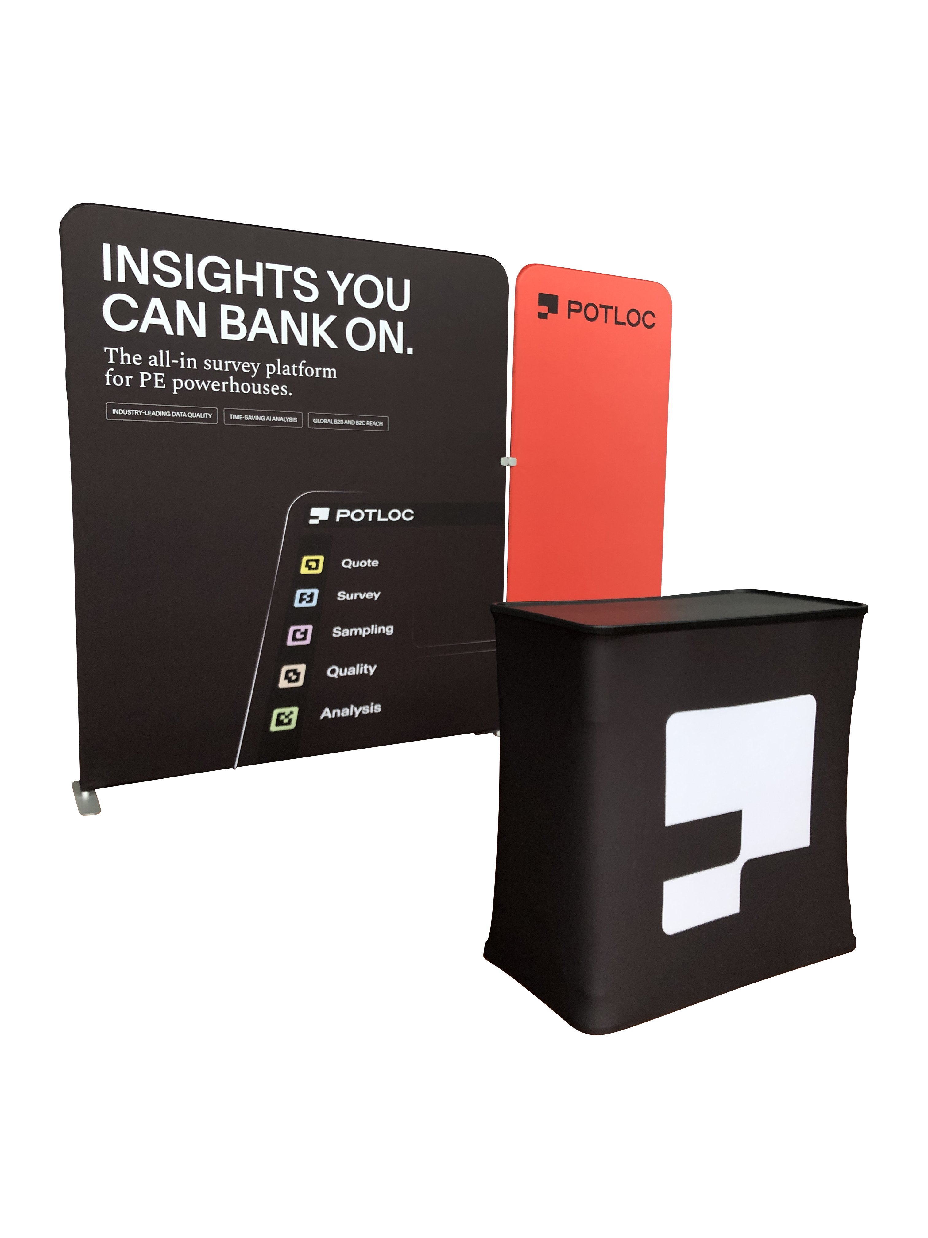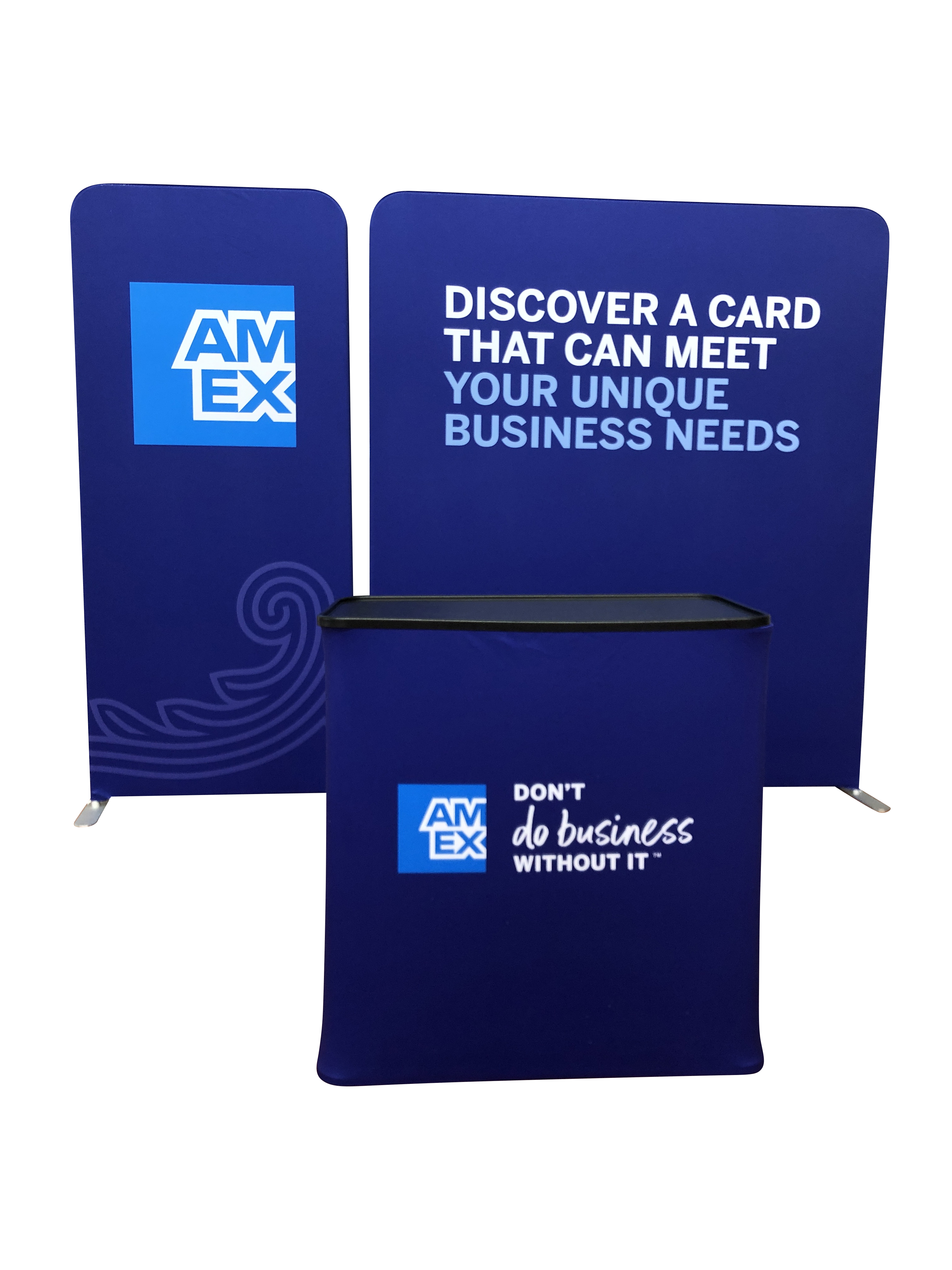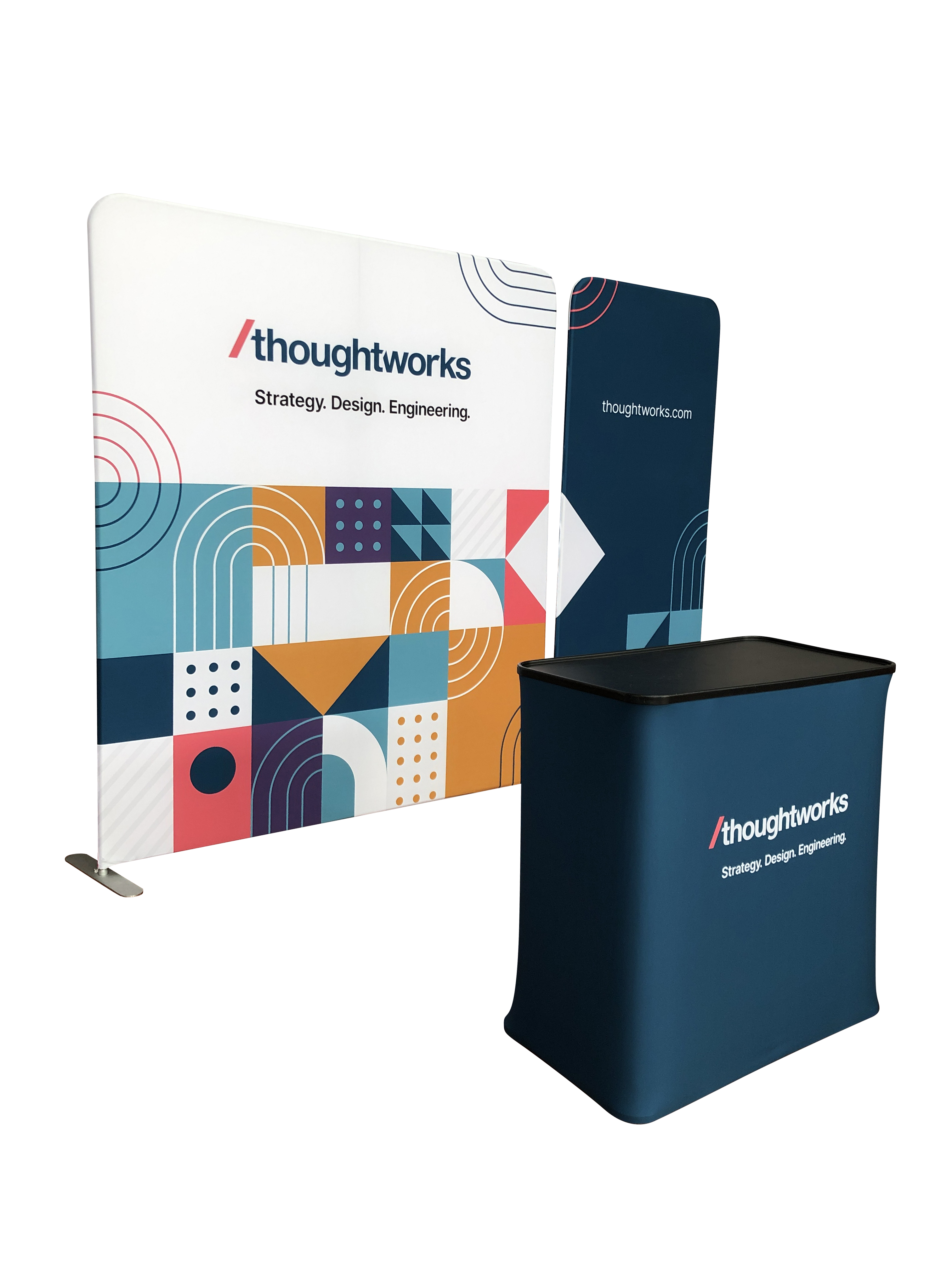 Our 10' Exhibit Kits include everything you need to make a big impact at your next trade show or event. You'll get 10 feet in width of custom double-sided printed tension fabric backdrops plus high-powered LED lights and a wooden shelf perfect for displaying brochures, promotional material, or merchandise. Everything packs up into the included hard-shell plastic wheeled case, that seamlessly converts into your booth's custom podium counter. This case allows for easy transportation in any car or plane, as you can check the case into oversized baggage. All kits include a small TV mount with VESA 75mm x 75mm and 100mm x 100mm compatibility.