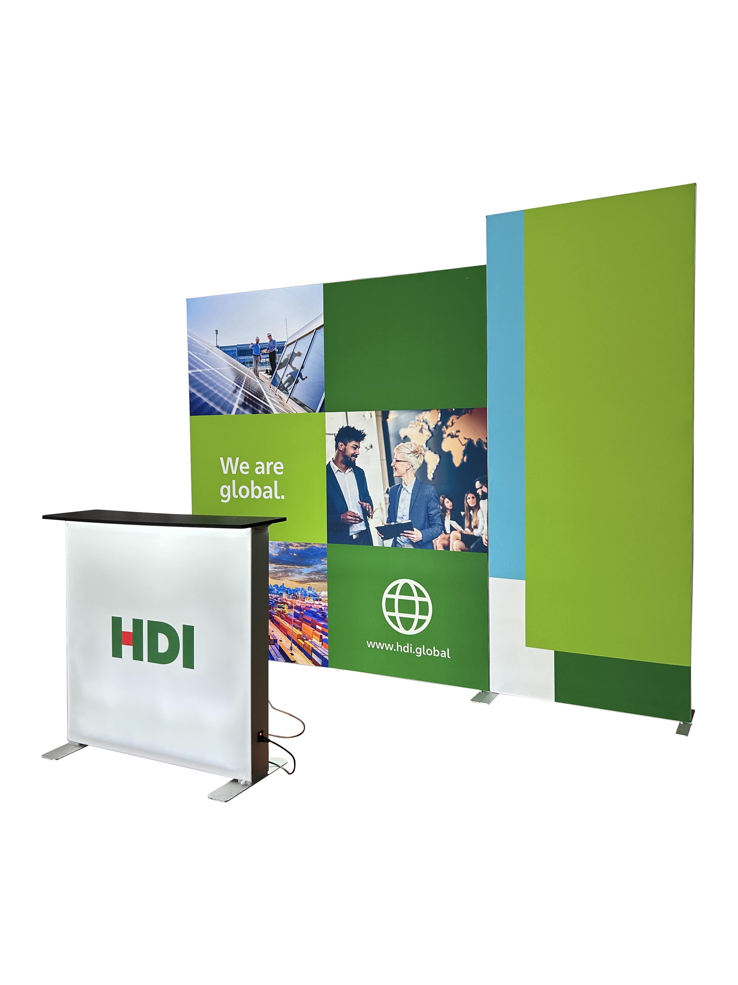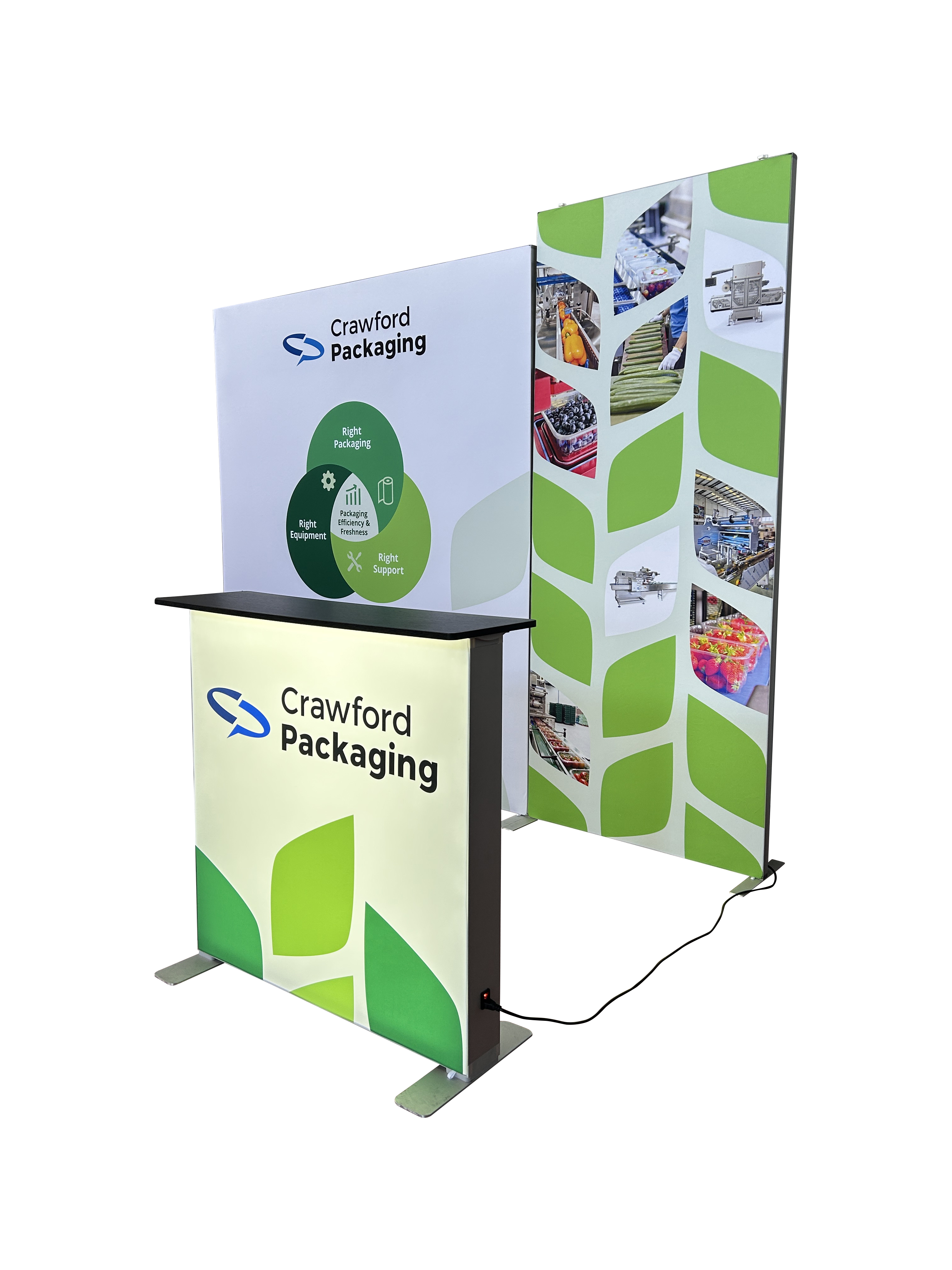 Our 10' SEG Exhibit Kits include everything you need to make a big impact at your next trade show or event. The kit includes two sleek aluminium silicon edge graphics backdrops, our popular Backlit SEG Podium and two high-powered LED lights.