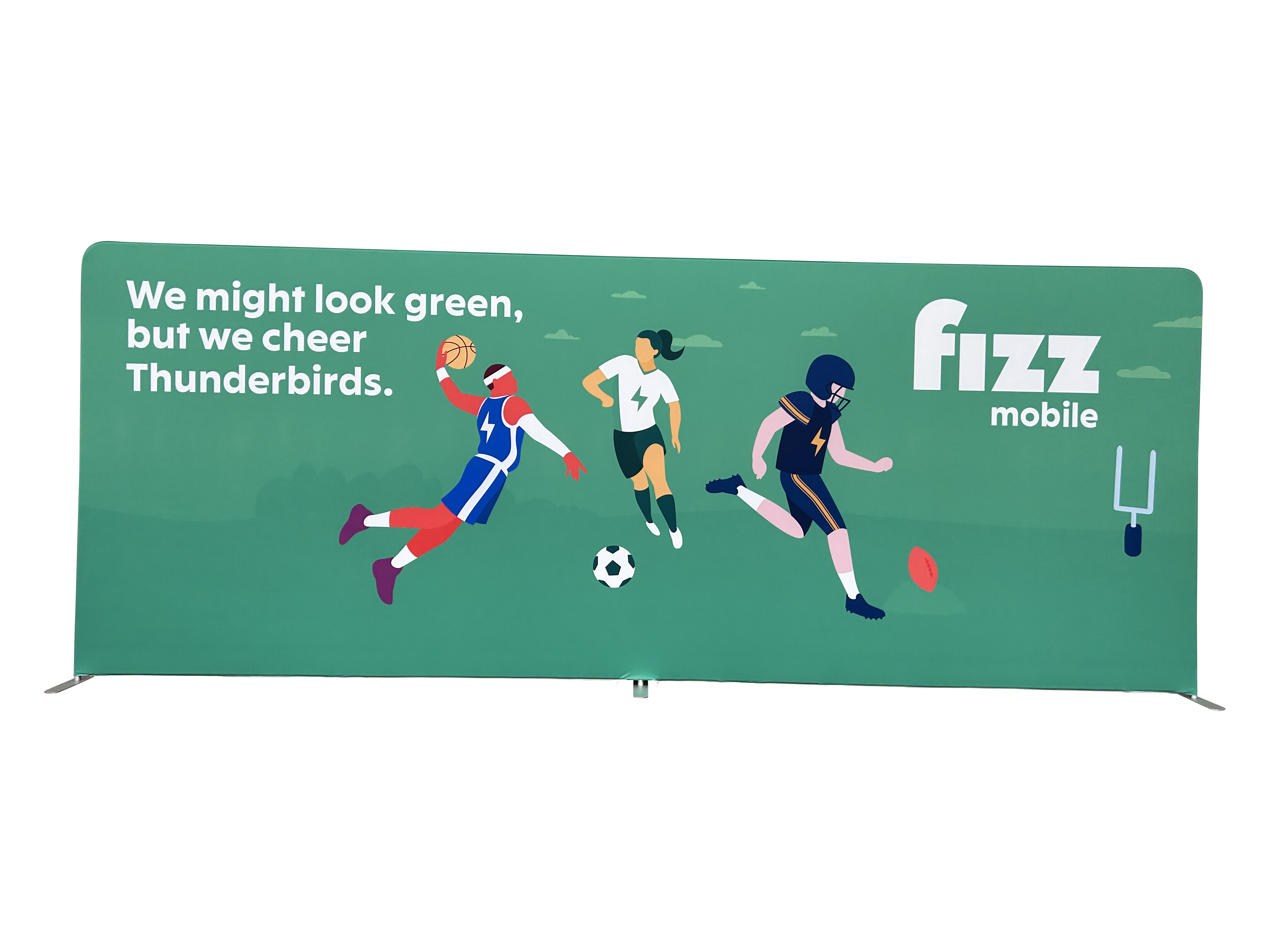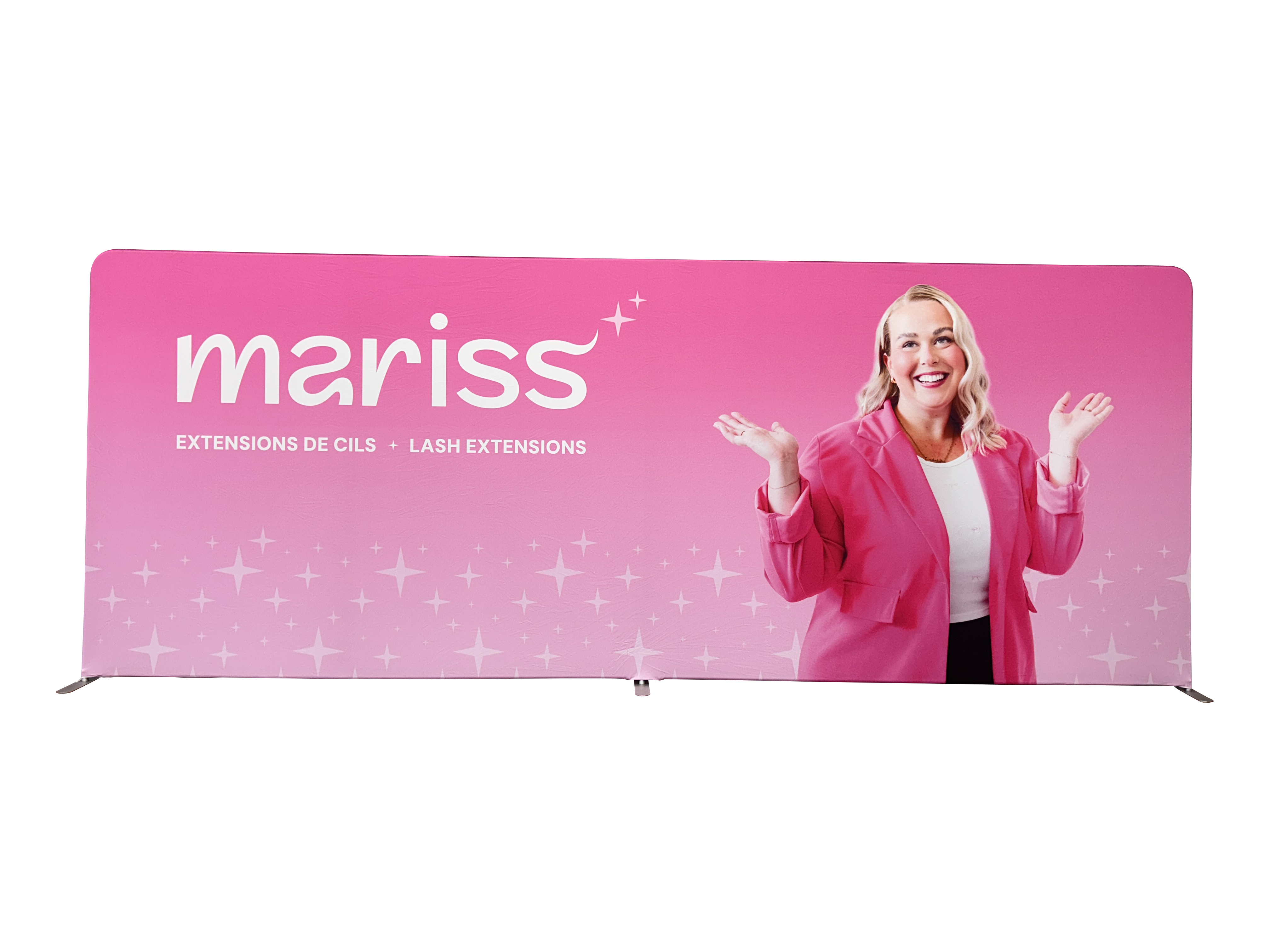 This straight, 20' wide x 7.5' tall tension fabric backdrop is built with lightweight aluminium tubes and sets up in minutes, tool-free. Comes with perfectly fitted dye-sublimated fabric printed with your custom artwork. Single sided and double sided printing available.