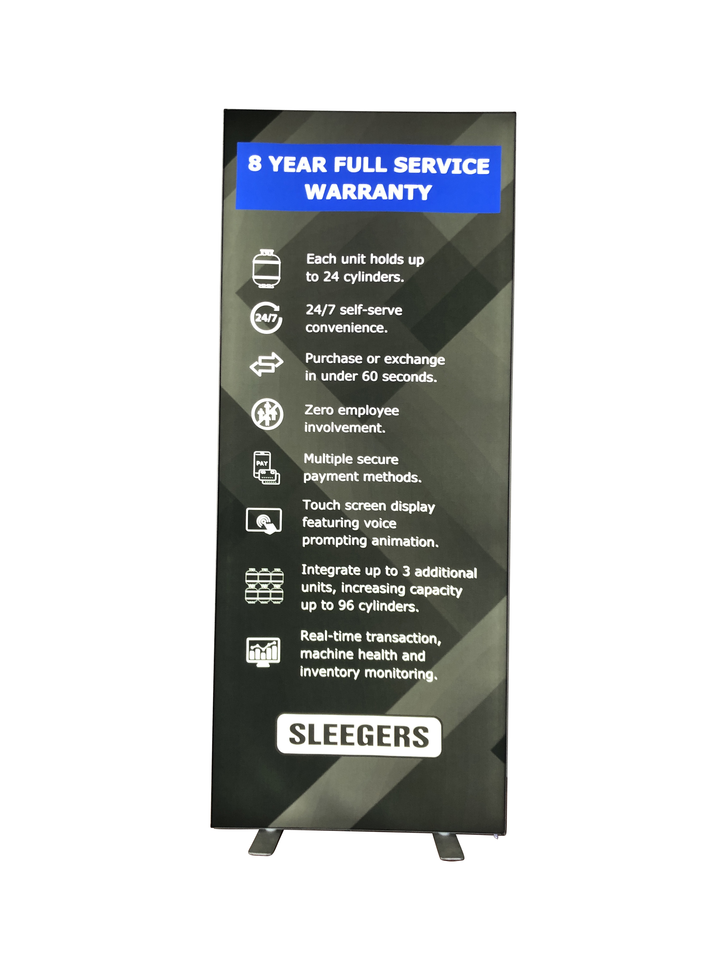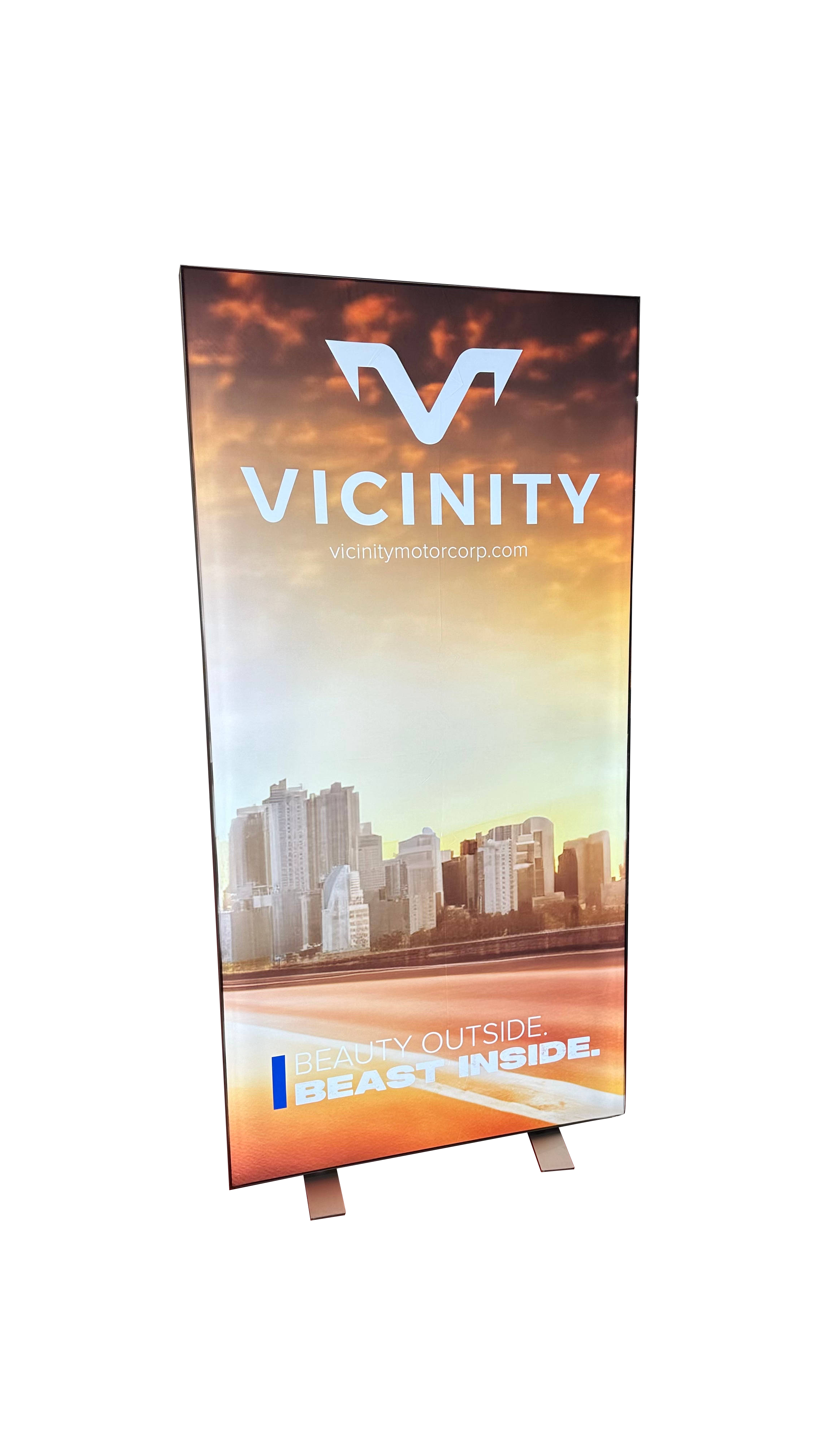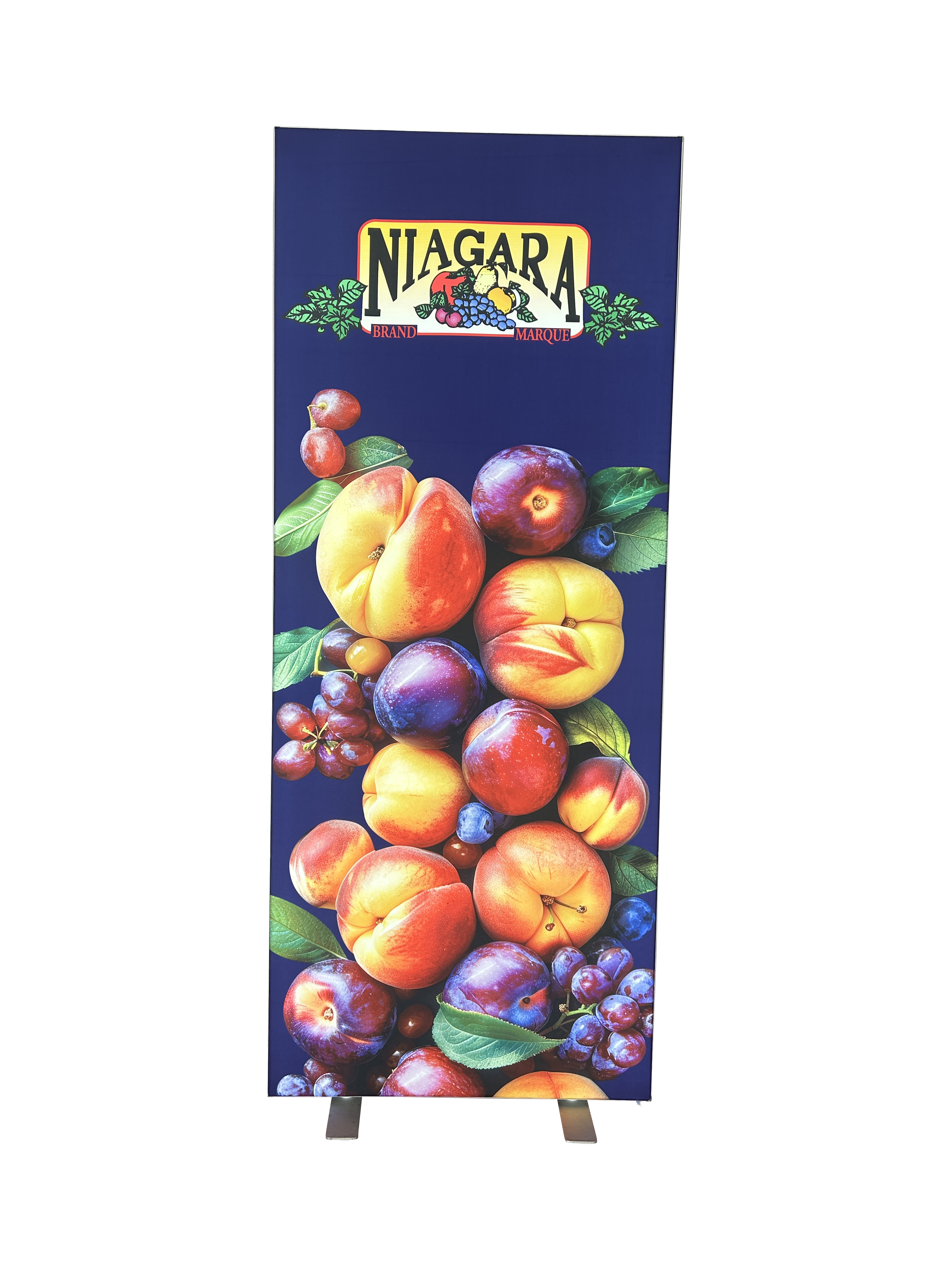 Our 3' wide SEG Lightbox is built with an 80mm aluminium frame with integrated LED lights. Comes with perfectly fitted dye-sublimated fabric printed with your custom artwork and a deluxe wheeled travel case. Simply assemble the frame, tuck in the fabric and plug in! Available in heights of 6.6ft or 8ft.
